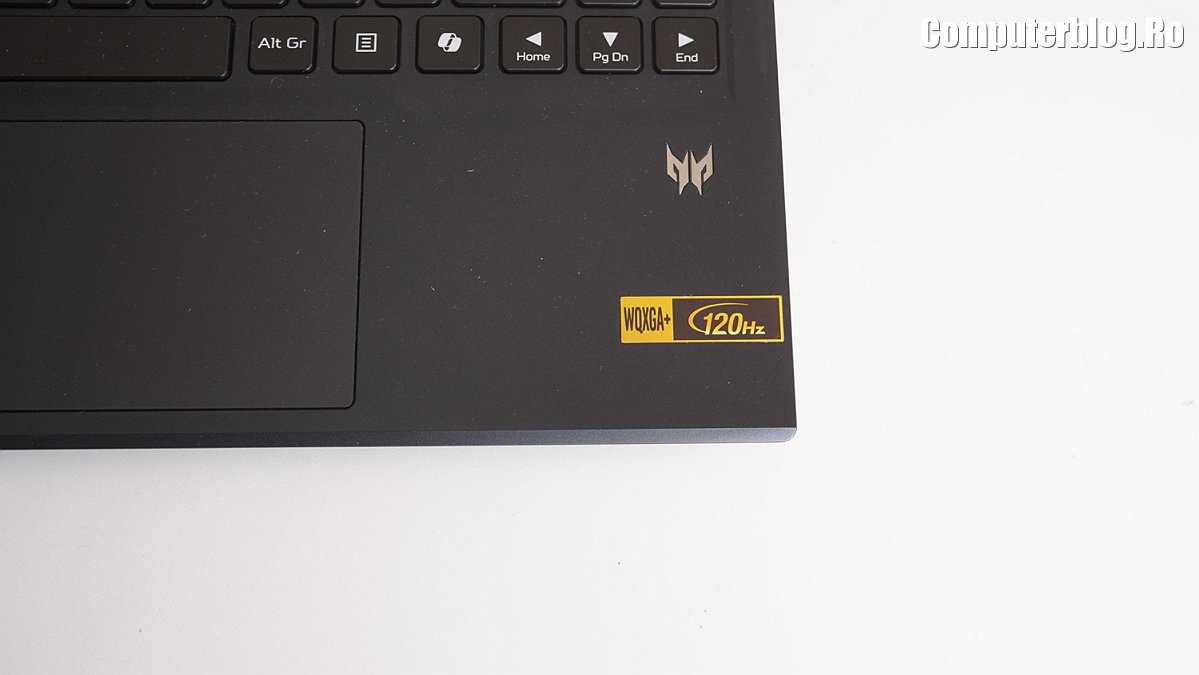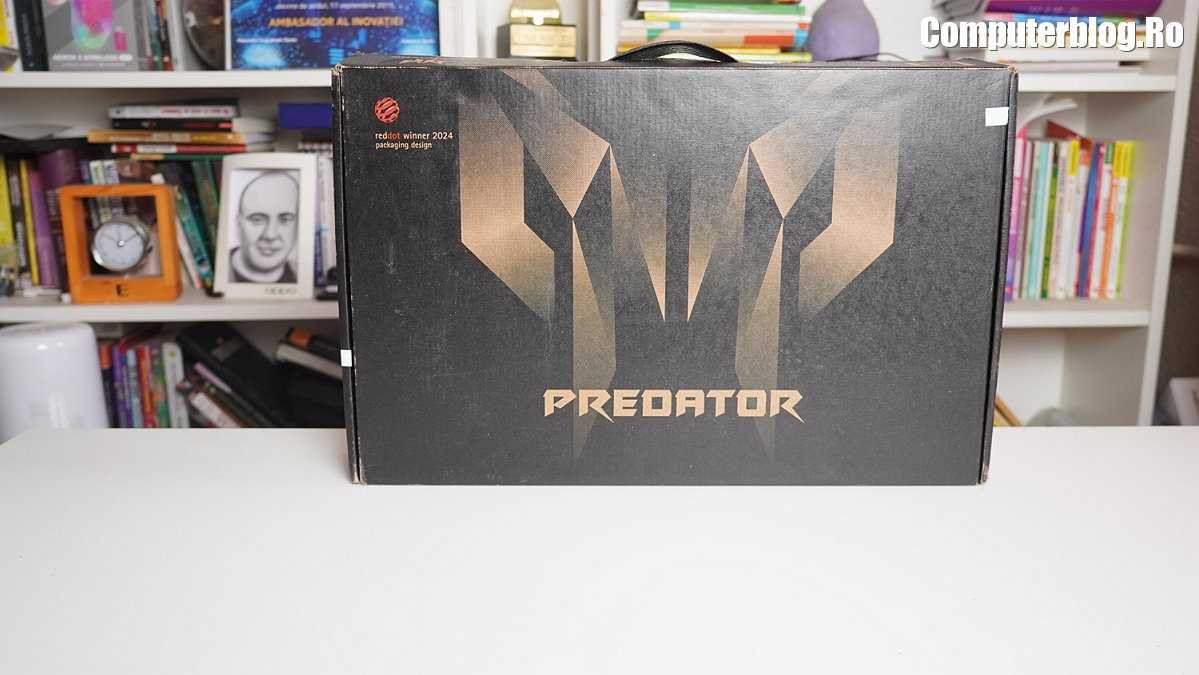 Laptopul este construit pentru a menține un profil compact în segmentul de 14 inci, având dimensiuni de aproximativ 20.8 x 323.9 x 254.7 milimetri și o greutate de 1.9 kilograme. Carcasa urmează o linie estetică sobră, cu un finisaj predominant închis la culoare și sigla Predator integrată pe capac. Structura combină aliaje metalice pentru șasiu și elemente din plastic rigid, o abordare necesară pentru a asigura un flux de aer adecvat răcirii componentelor de înaltă performanță într-un volum fizic redus.