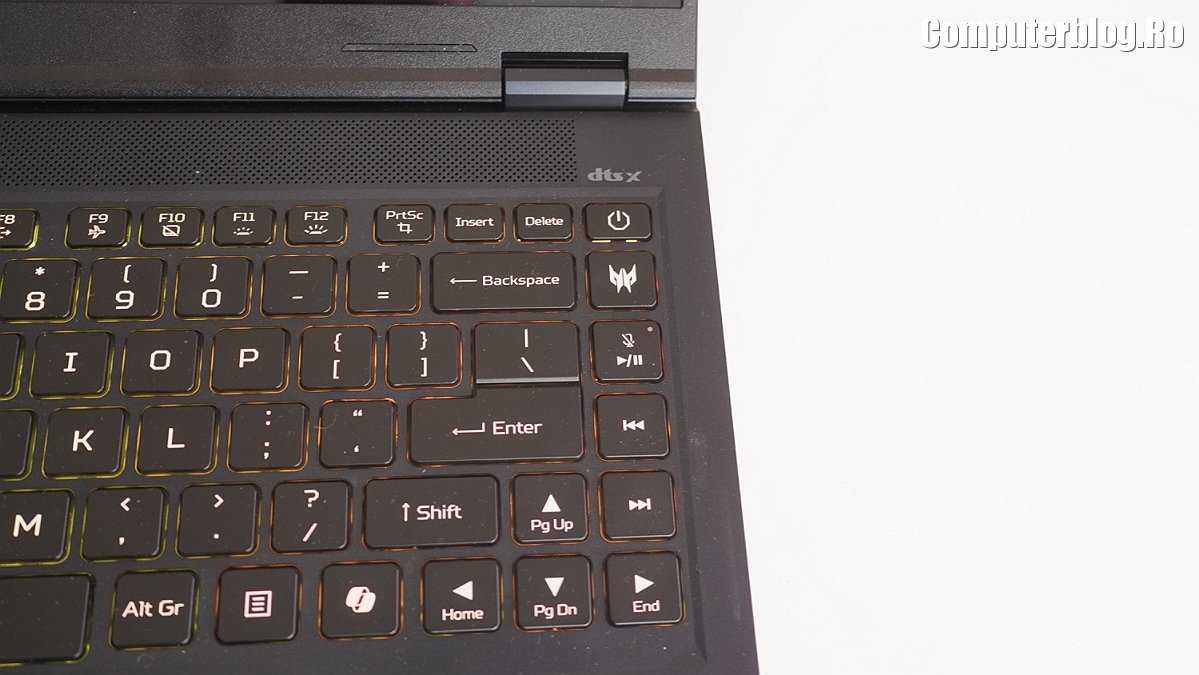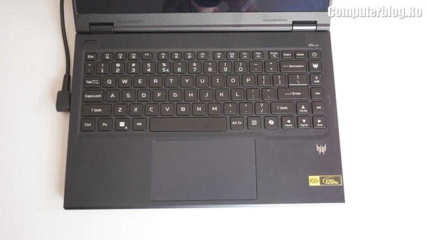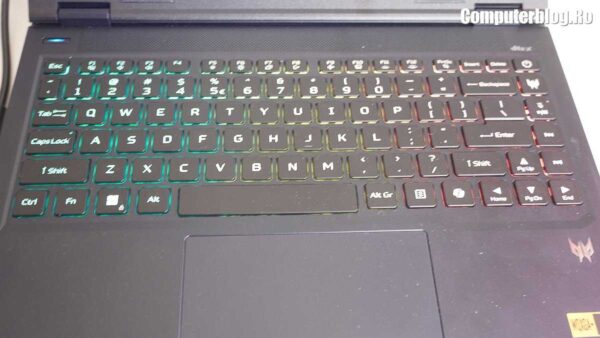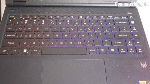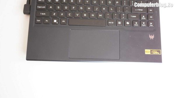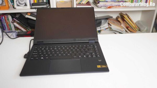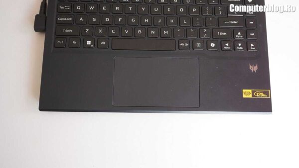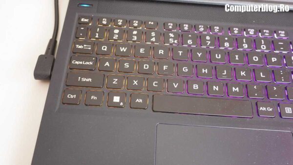 Tastatura utilizează un format chiclet și dispune de iluminare RGB configurabilă pe mai multe zone prin intermediul software-ului preinstalat. Feedback-ul tactil al tastelor este adaptat atât pentru sesiuni prelungite de redactare a textelor, cât și pentru acționări rapide, cu o cursă fermă și clar definită. Trackpad-ul este poziționat în jumătatea stângă a palm-restului, are o suprafață care glisează ușor și oferă suport complet pentru gesturile multi-touch specifice sistemului de operare Windows 11, integrând click-urile fizice direct sub suprafața de contact.