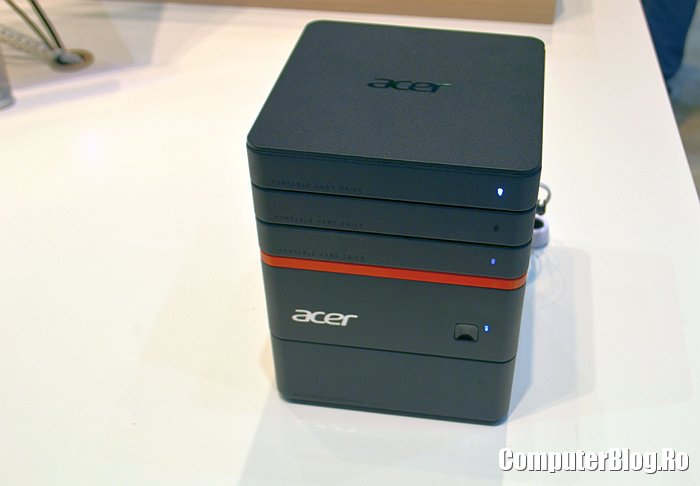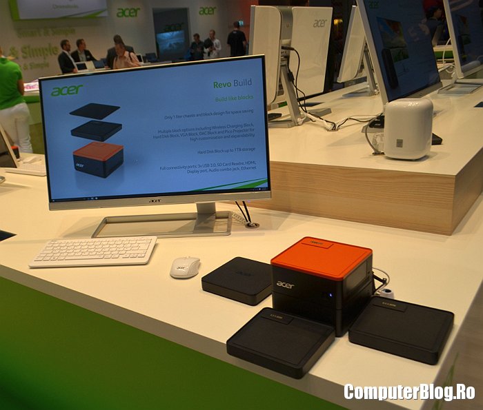 Am văzut la IFA Berlin noul mini-dektop modular Acer Revo Build. Știți ideea, un PC care poate fi îmbunătățit sau actualizat prin adăugarea unor cutii suplimentare sau schimbarea cutiilor originale. Spre deosebire de desktop-ul clasic, fieare piesă este într-o cutiuță standard, cu conectori. Ele se pun una peste alta și se conectează instant.