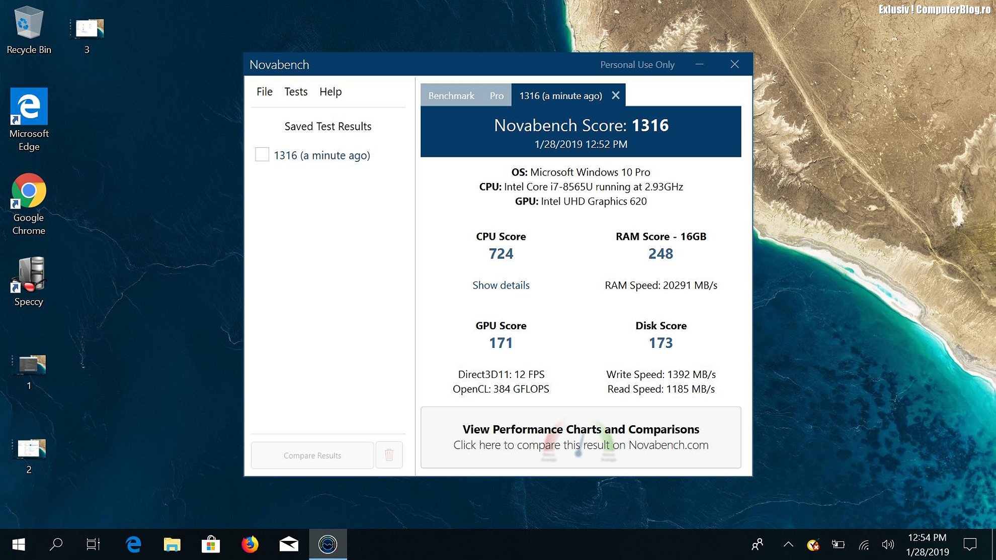 Procesorul este un Intel Core-i7 8565U, care rula la 1.80-1.99 GHz, deci varianta de top, dar totuși trebuie să recunosc că s-a încins ușor când testele de performanță au rulat pe el. Nu este nimic neobișnuit, dar probabil dacă vă uitați la un film full sau procesați video se va încinge și în utilizarea normală. Modelul testat a venit cu 16GB de RAM, precum și stocare pe un SSD de 512GB, foarte rapid.