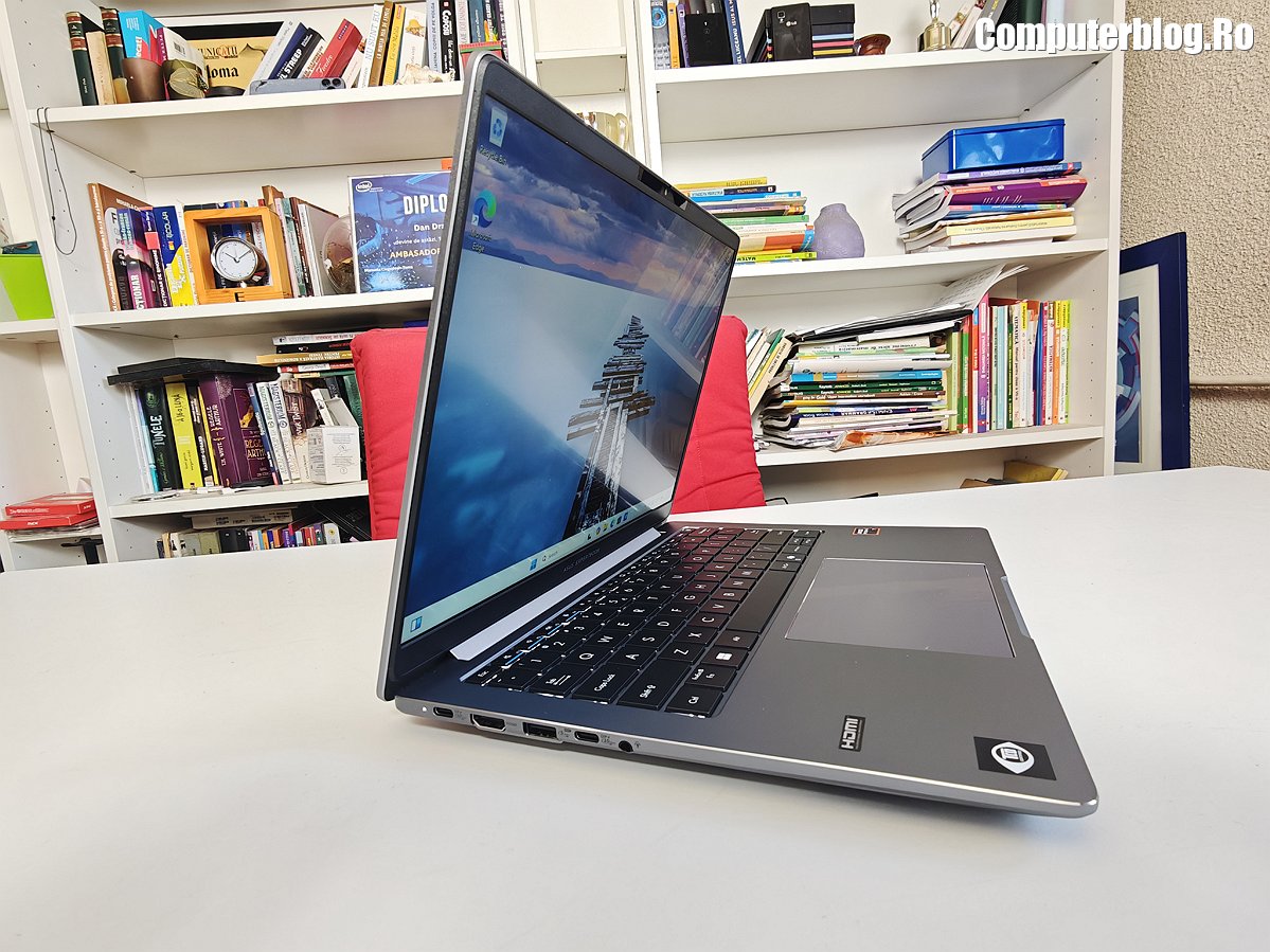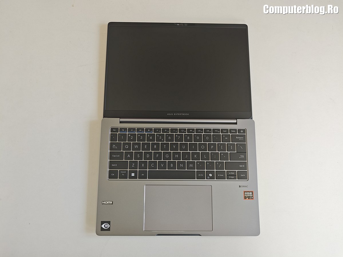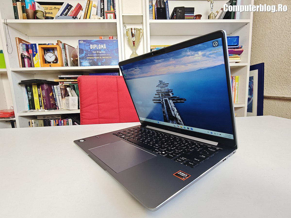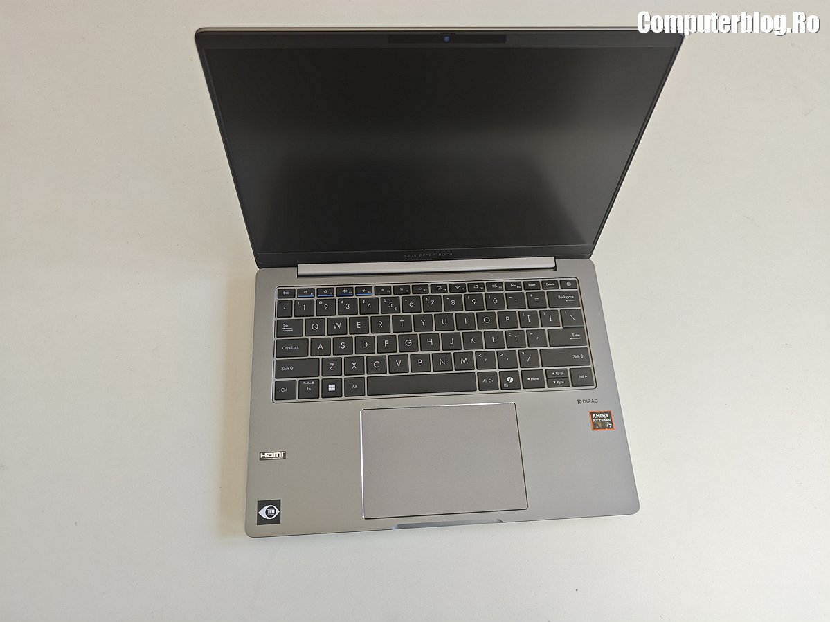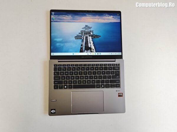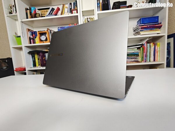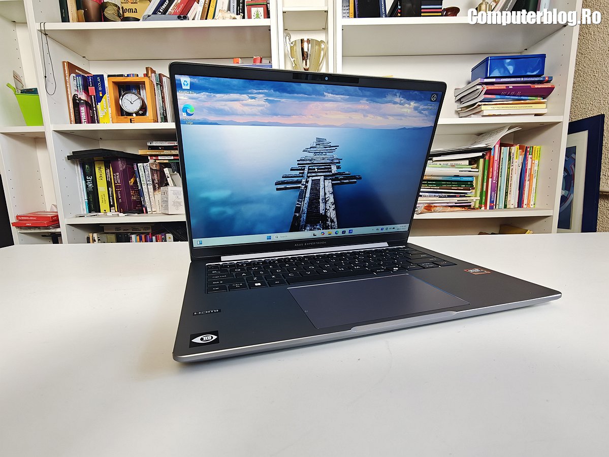 Unitatea grafică integrată este AMD Radeon 860M, asigură suportul vizual necesar, fiind optimizată pentru mediul de business și productivitate. Utilizează memorie DDR5 de înaltă viteză, cu configurații uzuale de 16GB sau 32GB, iar cea testată a avut chiar 64GB. Un avantaj major, rar întâlnit la laptopurile subțiri, este prezența a două sloturi fizice. În ceea ce privește stocarea, laptopul vine cu un SSD M.2 2280 NVMe PCIe 4.0 de 1TB, garantând timpi de boot și de încărcare a aplicațiilor destul de scurți. Sistemul termic ExpertCool este proiectat nu doar pentru a menține componentele la temperaturi optime în timpul utilizării intense, ci și pentru a asigura o răcire eficientă chiar și atunci când capacul este închis, o preocupare importantă pentru utilizarea în stațiile de andocare sau pentru a preveni supraîncălzirea accidentală.
