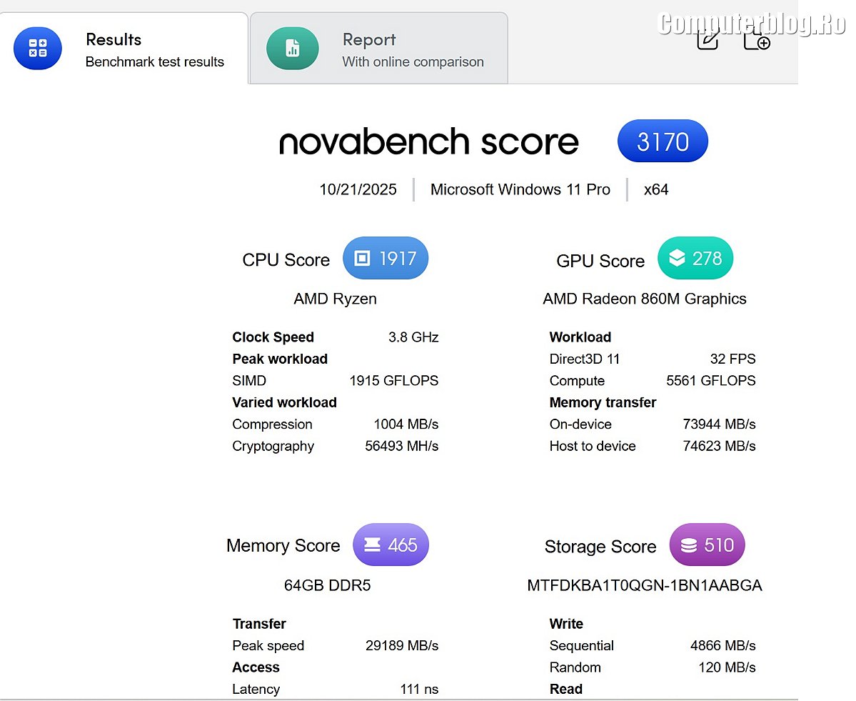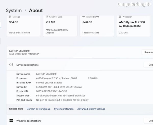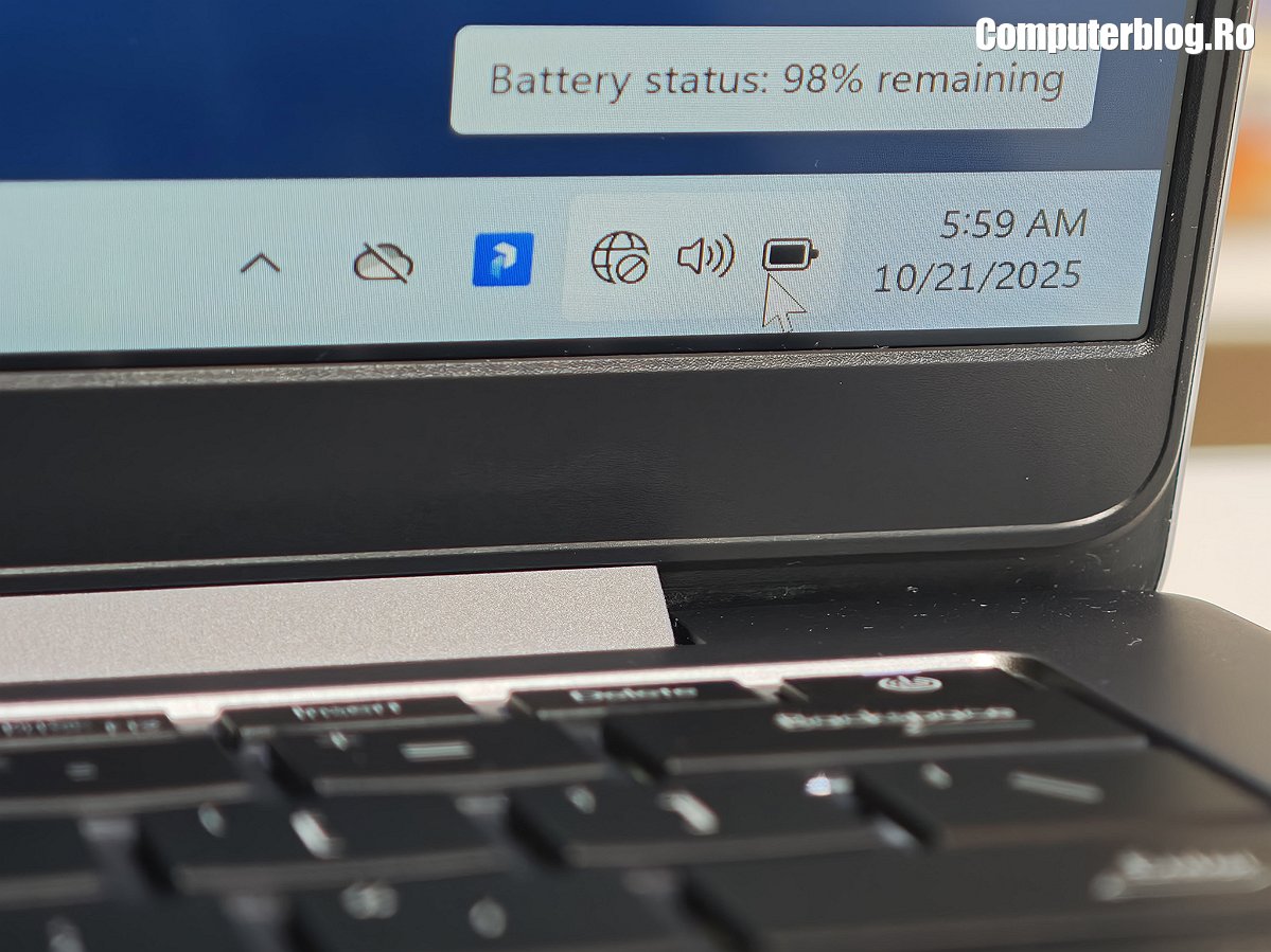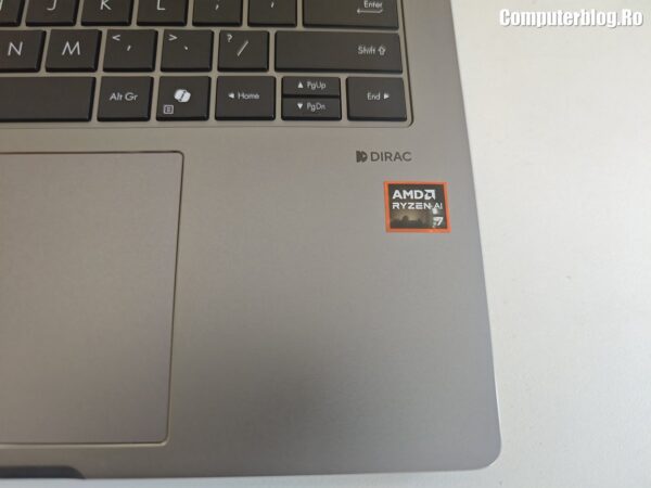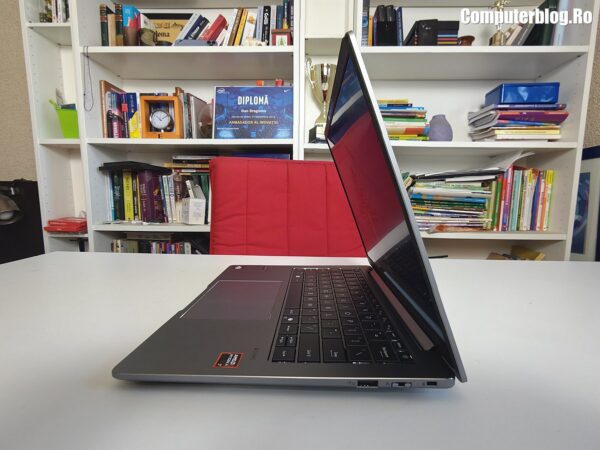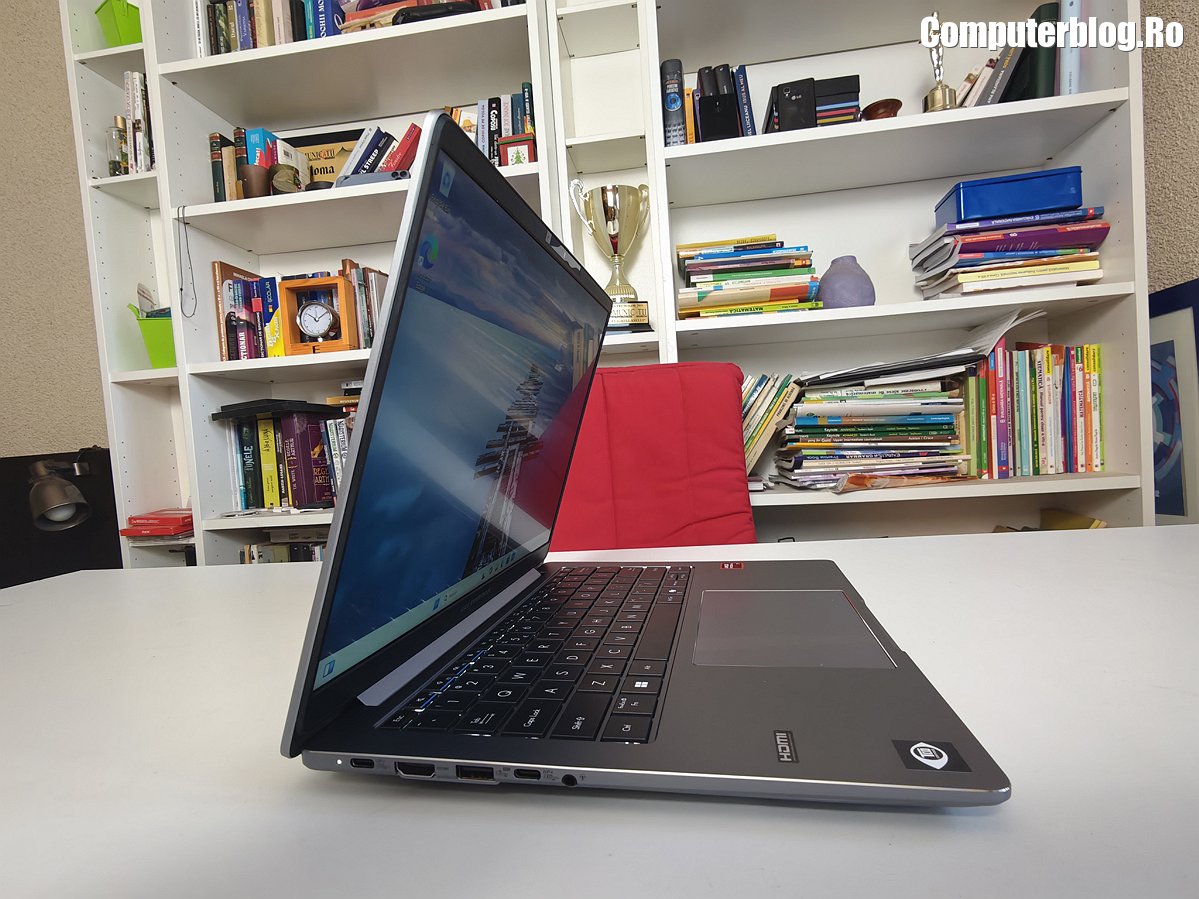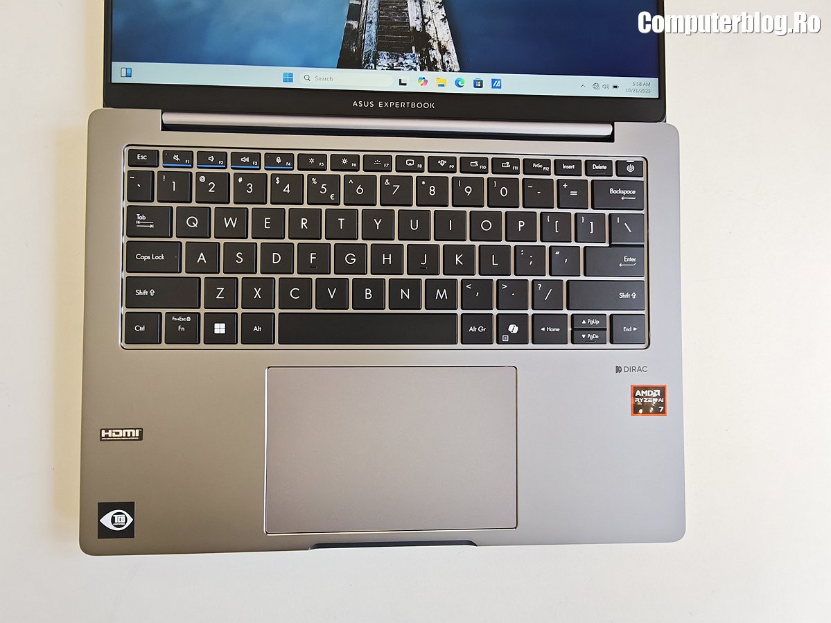 Unitatea grafică integrată este AMD Radeon 860M, asigură suportul vizual necesar, fiind optimizată pentru mediul de business și productivitate. Utilizează memorie DDR5 de înaltă viteză, cu configurații uzuale de 16GB sau 32GB, iar cea testată a avut chiar 64GB. Un avantaj major, rar întâlnit la laptopurile subțiri, este prezența a două sloturi fizice. În ceea ce privește stocarea, laptopul vine cu un SSD M.2 2280 NVMe PCIe 4.0 de 1TB, garantând timpi de boot și de încărcare a aplicațiilor destul de scurți. Sistemul termic ExpertCool este proiectat nu doar pentru a menține componentele la temperaturi optime în timpul utilizării intense, ci și pentru a asigura o răcire eficientă chiar și atunci când capacul este închis, o preocupare importantă pentru utilizarea în stațiile de andocare sau pentru a preveni supraîncălzirea accidentală.