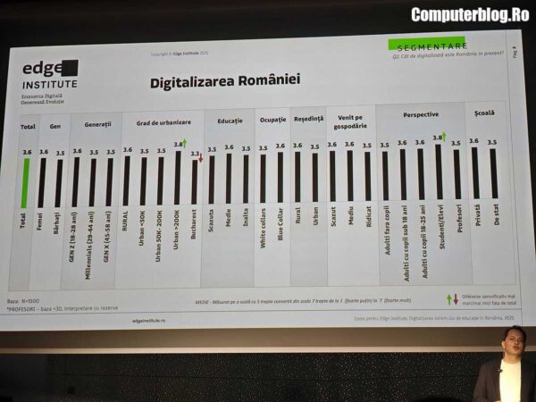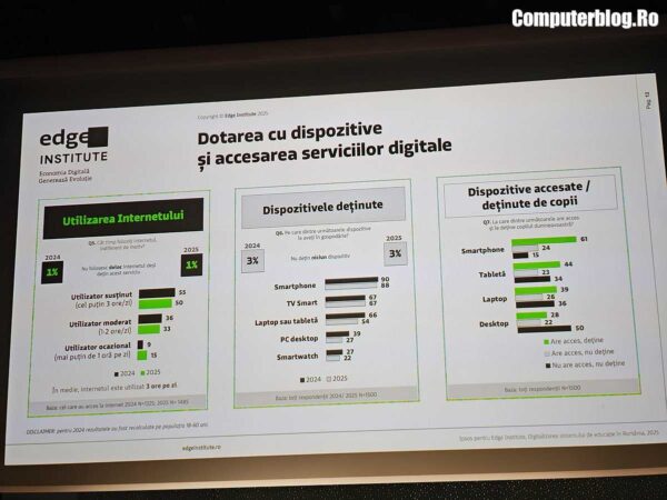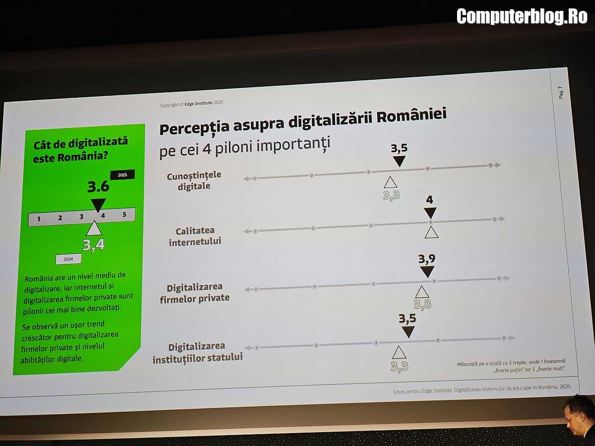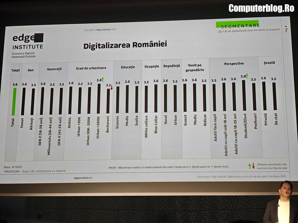 • Competențe digitale: Românii își evaluează propriile cunoștințe digitale la un nivel mediu (3.6 din 5). Elevii sunt considerați cei mai bine pregătiți din punct de vedere digital, urmați de profesori, în timp ce părinții sunt percepuți ca având cel mai scăzut nivel de pregătire.