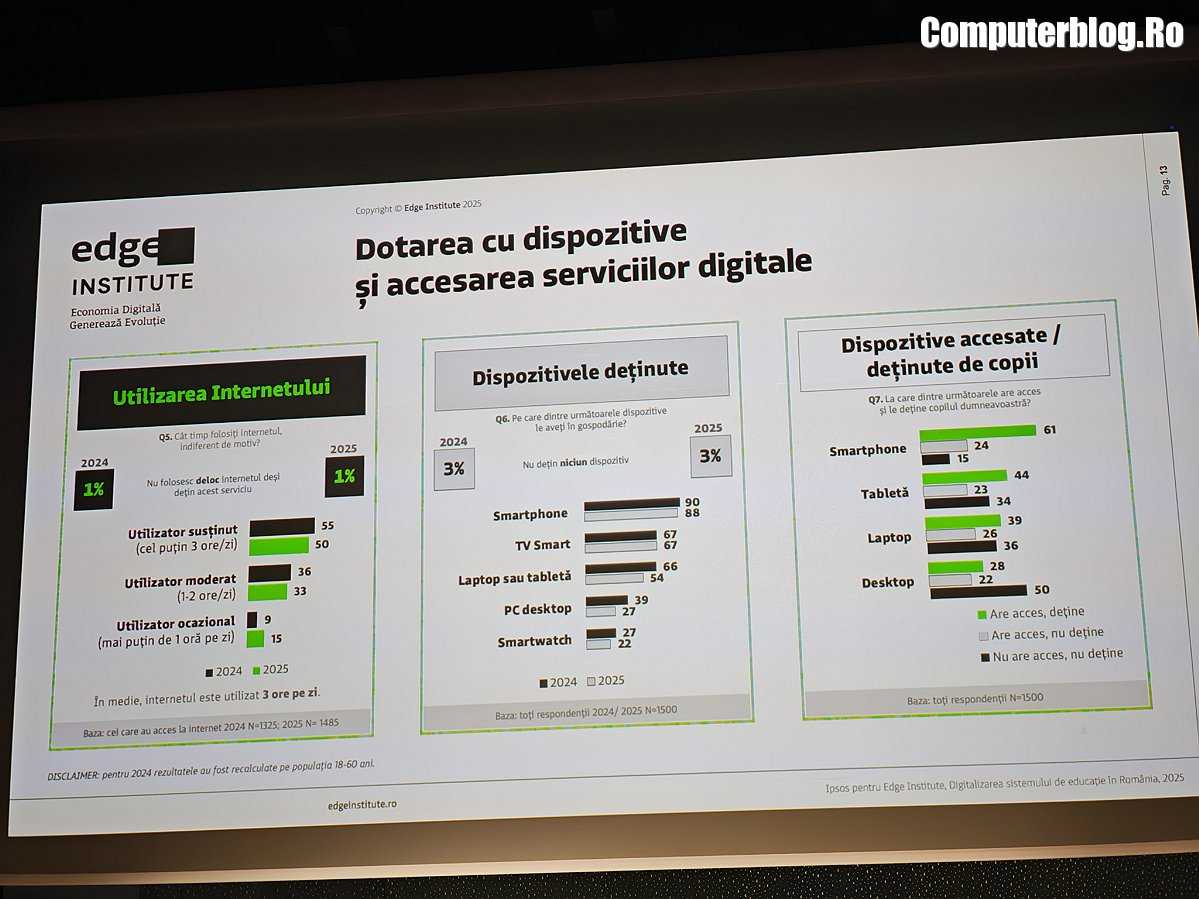 • Atitudinea față de digitalizare: Majoritatea românilor (72%) cred că intensificarea utilizării tehnologiei digitale în școli ar fi benefică și consideră pozitivă folosirea zilnică a dispozitivelor de către elevi. De asemenea, cred că digitalizarea ar face viața mai ușoară atât pentru elevi și profesori, cât și pentru părinți.