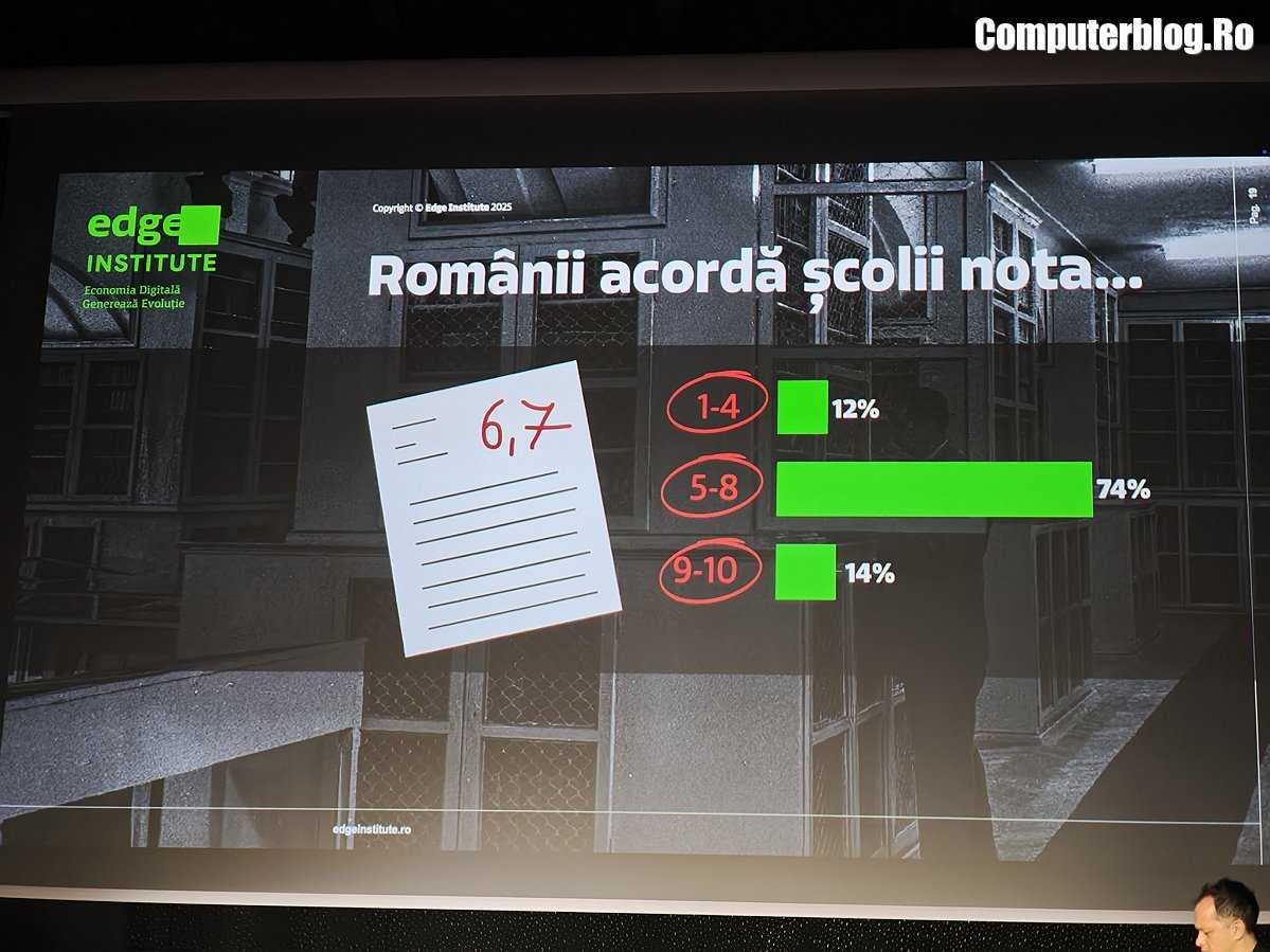 • Percepția asupra școlii de azi: Nota medie acordată sistemului de învățământ este de 6.7. Principalele caracteristici percepute sunt învățarea prin memorare și pregătirea pentru examene, în defavoarea dezvoltării abilităților digitale și a muncii în echipă.
