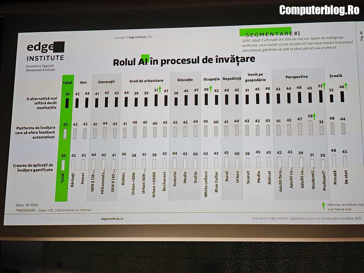 • Inteligența artificială: Românii văd inteligența artificială ca pe o oportunitate în educație, menționând beneficii precum alternative la meditații, feedback automatizat și aplicații de învățare. Temerile principale sunt legate de pierderea contactului uman și a relației directe dintre elevi și profesori.