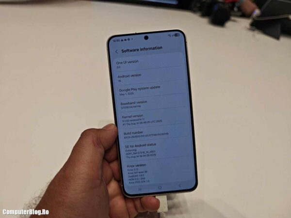 Măsoară 161,3 x 76,6 x 7,4 mm și cântărește 190 g. A fost listat doar în culoarea bleumarin, dar Samsung a pregătit și alte trei culori: Jetblack, White and Icyblue. De asemenea, nu este surprinzător că veți primi o suită de funcții AI, care include Gemini Live.