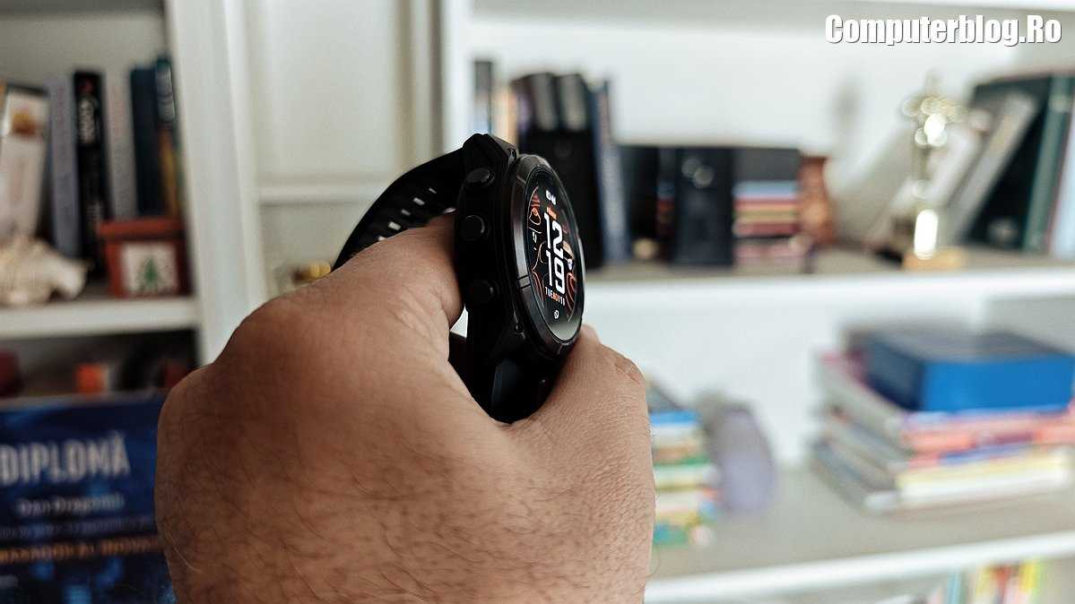 Cel mai mare punct forte al acestui model este ecranul MicroLED de 1.4 inch. Este primul de acest tip într-un smartwatch, având peste 400.000 de LED-uri individuale. Luminozitatea atinge până la 4.500 nits, astfel că ecranul rămâne clar, foarte lizibil chiar și în plin soare. În realitate am testat — culorile sunt saturate, dar naturale, negrul e profund, contrastul foarte bun.