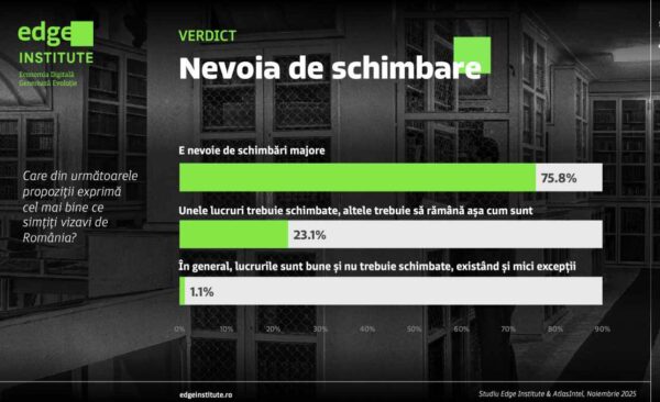 84% dintre români spun că ritmul digitalizării statului este unul lent sau foarte lent. Percepția indică o dezaliniere clară între așteptările cetățenilor și viteza reală cu care avansează transformarea digitală în instituțiile publice. Trei sferturi dintre români (75,8%) spun că România are nevoie de schimbări majore – un indicator clar al presiunii publice pentru modernizare. Această nevoie puternic exprimată se aliniază cu nemulțumirea față de ritmul actual al digitalizării: oamenii nu mai vor doar servicii online, ci o transformare reală a modului în care funcționează statul.