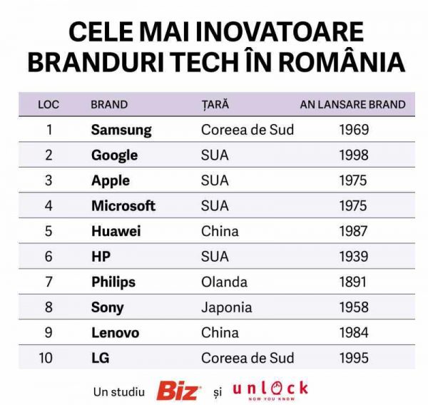 Studiul a fost realizat pentru revista Biz de Unlock Market Research, în luna martie 2020. Top 10 este completat de Microsoft, Huawei, HP, Philips, Sony, Lenovo și LG.