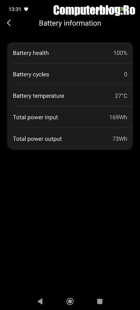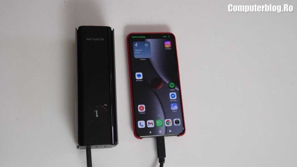 Reîncărcarea bateriei propriu-zise se realizează tot la o viteză de până la 140W. Această capacitate permite acumulatorului să ajungă de la 0 la 100% într-un interval de timp redus, de aproximativ o oră sau puțin peste, în funcție de încărcătorul de priză utilizat. Eu cu un încărcător de 120W am obținut 1 oră și 25 de minute. Această caracteristică elimină timpii lungi de așteptare asociați de obicei cu bateriile de capacitate mare.