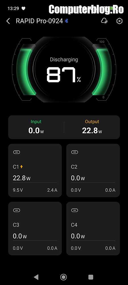 Integrarea cu aplicația EcoFlow extinde funcționalitatea Rapid Pro 27K prin conexiune Bluetooth, oferind o interfață digitală pentru monitorizarea și gestionarea parametrilor tehnici direct de pe telefonul mobil. Această conexiune permite vizualizarea în timp real a fluxurilor de energie, detaliind exact câți wați intră sau ies prin fiecare port în parte, precum și temperatura internă a dispozitivului, oferind o imagine de ansamblu mai detaliată decât ecranul integrat pe carcasă.