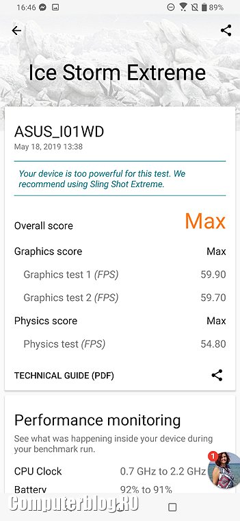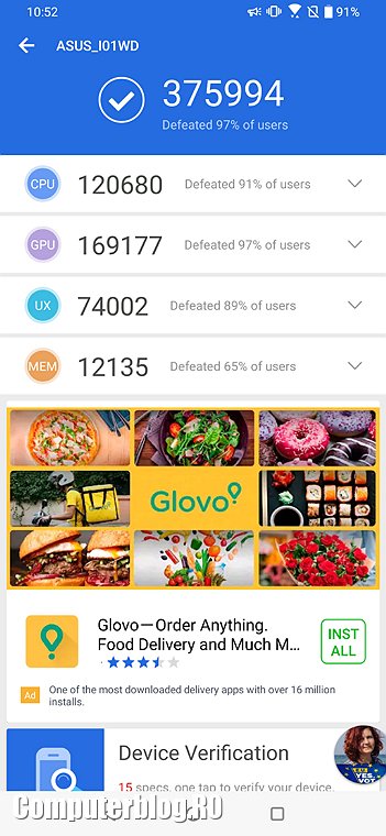 Procesorul este de top, Snapdragon 855, dar în testele realizate de colegi a atins chiar 380.000 de puncte în Antutu, spulberând orice competiție. Telefoanele rivale cu Android abia ating 355.000, Xiaomi Mi9 a mai depășit scorul obținând vreo 370.000, iar iPhone XS Max a atins 360.000 de puncte. Spre comparație Galaxy S10 are vreo 355.000, iar P30 Pro nu trece de 320.000 de puncte. Oricum, este clar că procesorul Zenfone 6 și funcția de AI Boost, care prioritizează aplicația din prim-plan și îi alocă toate resursele, au reușit acum să facă diferența față de competitori cu aceleași specificații tehnice. Și asta arată că pe partea de design și ingierie Asus stă foarte bine.