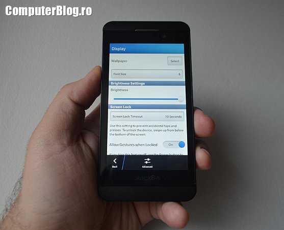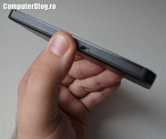 Blackberry Z10 este suficient de ușor și subțire, da nu chiar ca iPhone 5. Butonul de Power/Lock este sus pe mijlocul ecranului, cu alte cuvinte ajungi greu la el. Pe lateral sunt butoane de volum și un buton central care nu prea face nimic. Dacă apeși prelungit pe el apare un soi de aplicație pentru comenzi vocale. Iconițele din meniu sunt relativ aceleași și ușor de recunoscut, dar mi se par cam mari, comparat cu dimensiunea ecranului.