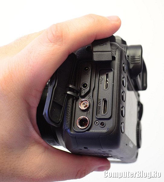 Dispune de o grămadă de opțiuni de conectare, pentru orice situație. Mufă USB, mufă HDMI, conector de microfon, de căști, poți să folosești camera pentru filmări cu microfon și așa mai departe.