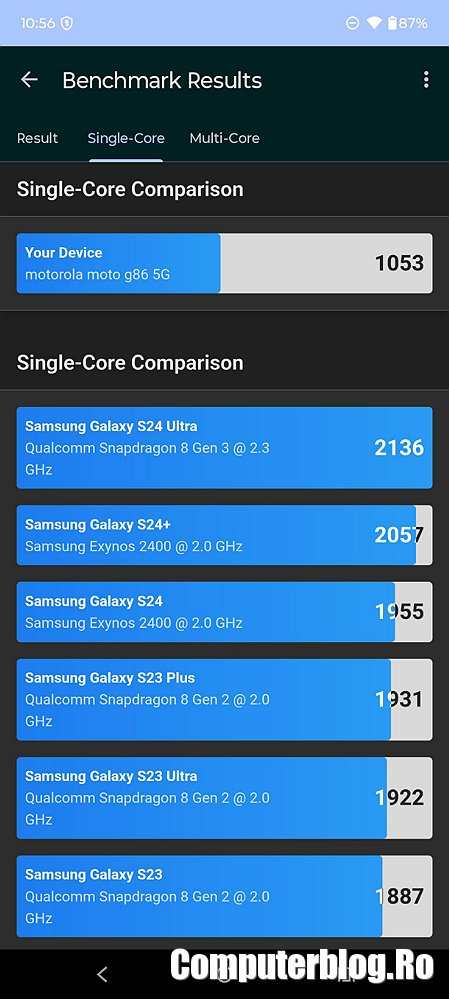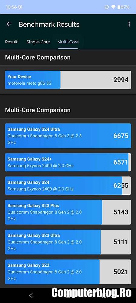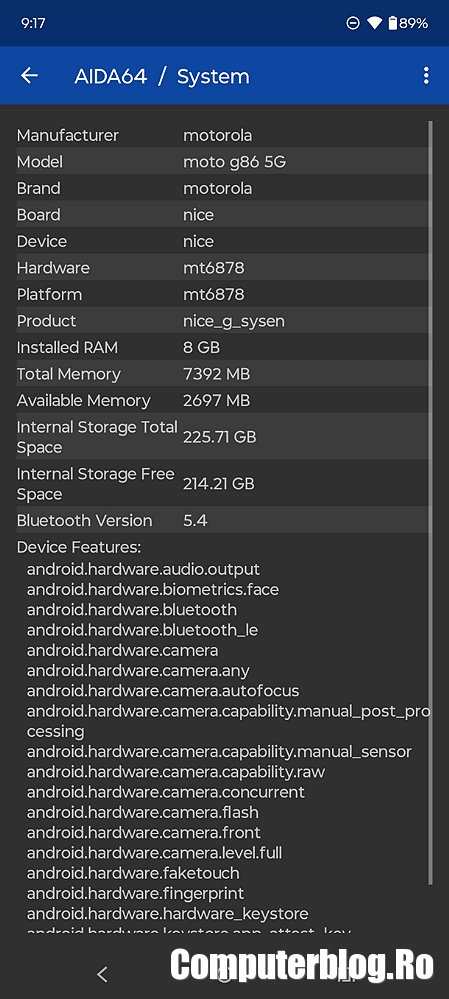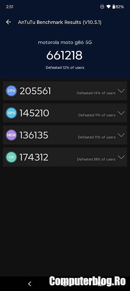Procesorul este de nivel mediu, Mediatek Dimensity 7300, are patru nuclee de putere Cortex-A78 la 2,5 GHz și alte patru economice, Cortex-A55, la 2,0 GHz. Nu este de gaming, dar se descurcă cu aproape orice aplicație. Vine în varianta de 8 GB de RAM și 256 GB de stocare, cea de bază. Are Android 15 cu noua interfață Motorola care se cheamă acum Hello UI. Nu este modificat prea tare, totuși, Moto reușește să aducă aici problema bateriei de la modelele Edge. Dacă înainte seria Moto G era renumită pentru autonomie, acum la test a ținut destul de slab. Este adevărat, ei se concentrează pe Moto G86 Power, o variantă cu baterie mai mare. Dar și ăsta are acumulator de 5.200 mAh și în mod normal ar fi trebuit să țină. Doar că rezultatele le vedeți mai jos.
