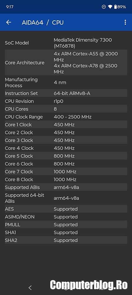 MediaTek Dimensity 7300 este un SoC de gamă medie. CPU-ul integrat este împărțit în două clustere. Unul cu patru nuclee ARM Cortex-A78 mai mari, cu o viteză de ceas de până la 2,5 GHz, și un cluster de eficiență cu patru nuclee ARM Cortex-A55 cu o viteză de până la 2 GHz. Pe lângă iGPU-ul ARM Mali-G615 MC2 integrat, 7300 oferă și un APU MediaTek 655 pentru sarcini de inteligență artificială. În plus, este instalat un modem multi-mod 5G (2G – 5G) cu o viteză de descărcare de până la 3,27 Gbps. Pe lângă Wi-Fi 6E, este acceptat și Bluetooth 5.4. Cipul este fabricat folosind procesul modern de 4nm.