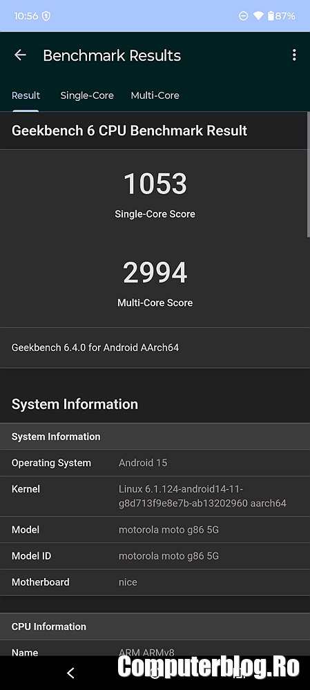 Scorul Geekbench 6 a fost de circa 1050 puncte single-core și aproape 3000 de puncte multi-core. Cel din AnTuTu a atins doar 662.000 de puncte. Nu este un telefon pentru pasinați de gaming.
