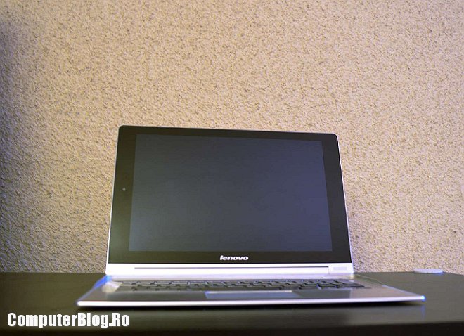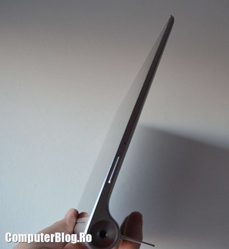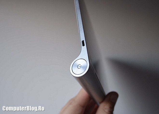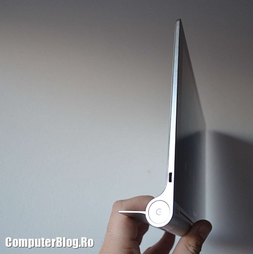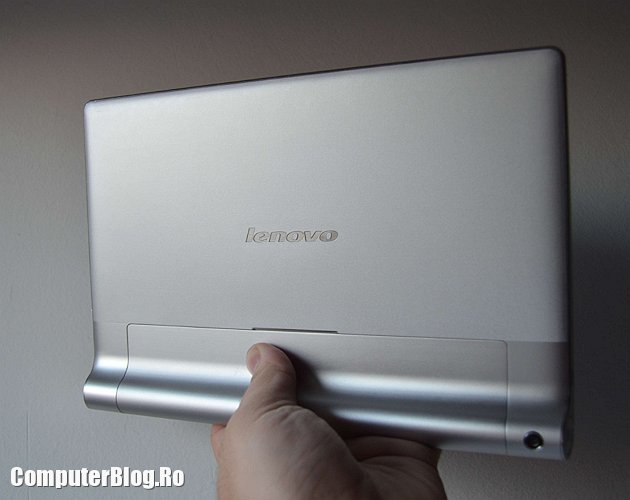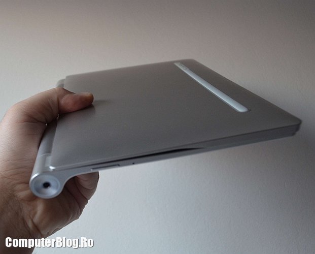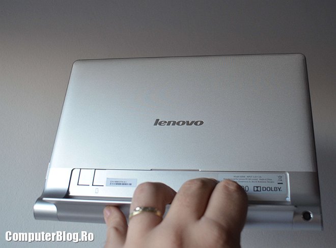Tableta este destul de ușoară pentru a fi ținută cu o mână. Am văzut multe tablete de 10 inch, în special cele accesibile ca preț, care au greutate mare și obosești cu ea în mână. Cu tableta Yoga poți lucra lejer și ai o priză mai bună, nu o scapi pe jos. De asemenea poți poziționa ecranul în două feluri – ca în poza de mai sus, pentru scris cu tastatura sau pentru vizionat filme sau culcat pe masă cu piciorul ridicat, astfel încât să poți fac browsing sau să joci jocuri touch și așa mai departe.
