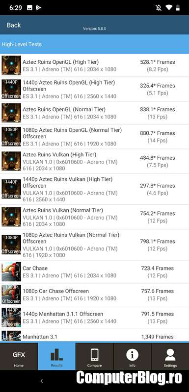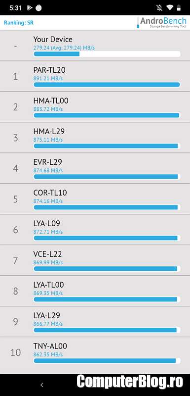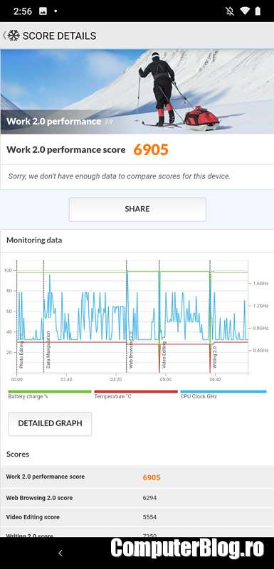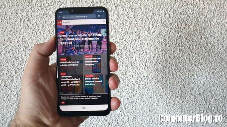 Surpriza plăcută a fost și la autonomia obținută. Bateria nu este cea mai mare, dar cred că au ținut la design și 3.500 mAh se dovedește foarte ok. Am rulat testul de pe Youtube, pentru că celălalt test nu mai funcționează pe Android 9. Contorul de pe Youtube cu 7 ore a rulat de două ori și tot mai avea baterie. Putem presupune că 15 ore de utilizare cu ecranul aprins, dar pe partea de video. Probabil în utilizarea normală trece de o zi dacă nu vă băgați să faceți foarte multe fotografii și filmări.