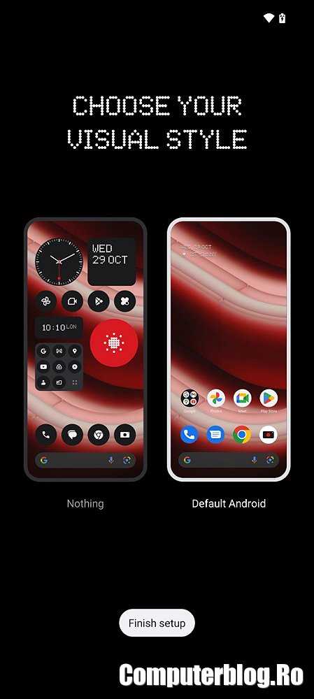 Evident, au realizat o interfață proprie, iar Android nu este curat, vorbim despre Nothing OS. Interfața vizuală ia elemente de design Nothing și a fost botezată Glyph. De altfel, luminile de pe spate sunt Glyph Lights. Au aplicație care combină elemente vizuale și muzicale, denumită Glyph Composer. Arată într-un fel specific.