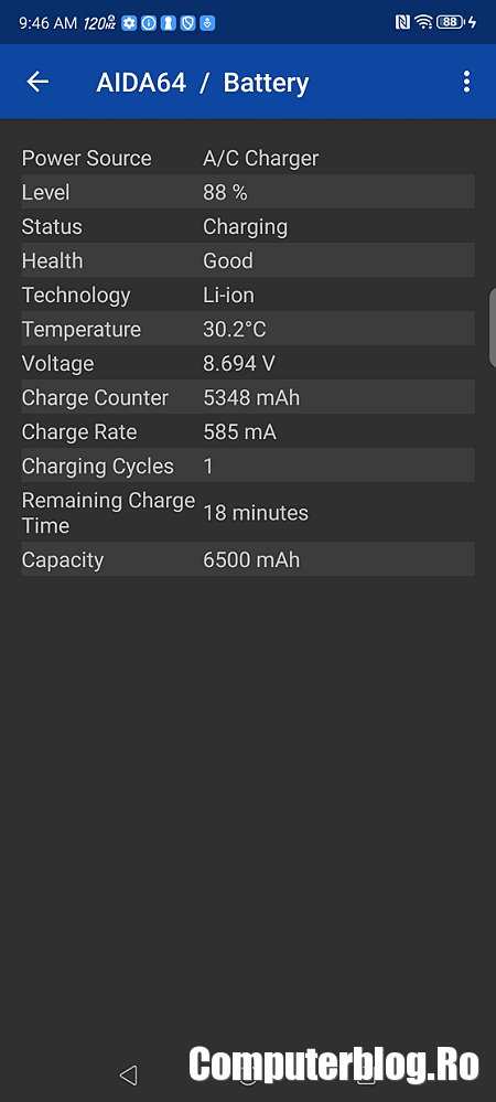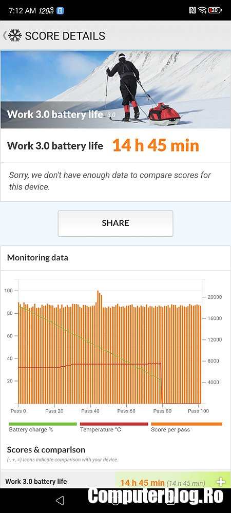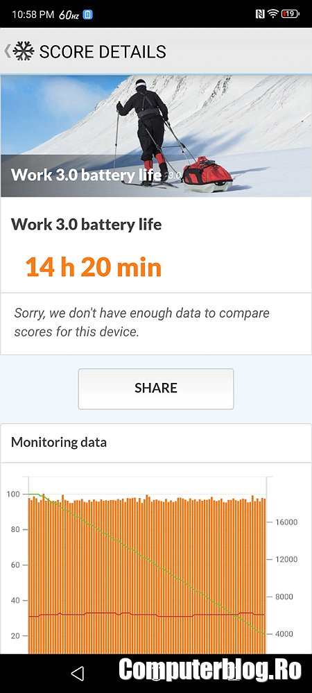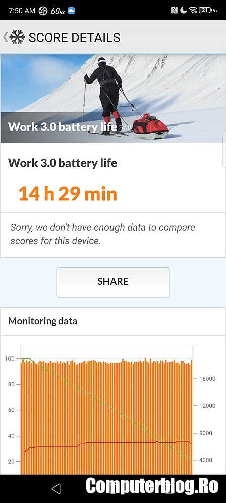 Bateria integrată este de 6.500 mAh, dar gestionarea autonomiei este slabă. Fără nicio setare specială a ținut 14 ore și 45 de minute, ceea ce este bine. Partea slabă vine la aplicarea Power Saving și trecerea ecranului pe un mod mai economic. În loc să iasă mai bine, autonomia a ieșit 14 ore și 20 de minute. Am crezut că este o eroare, am repetat testul, cu același rezultat.