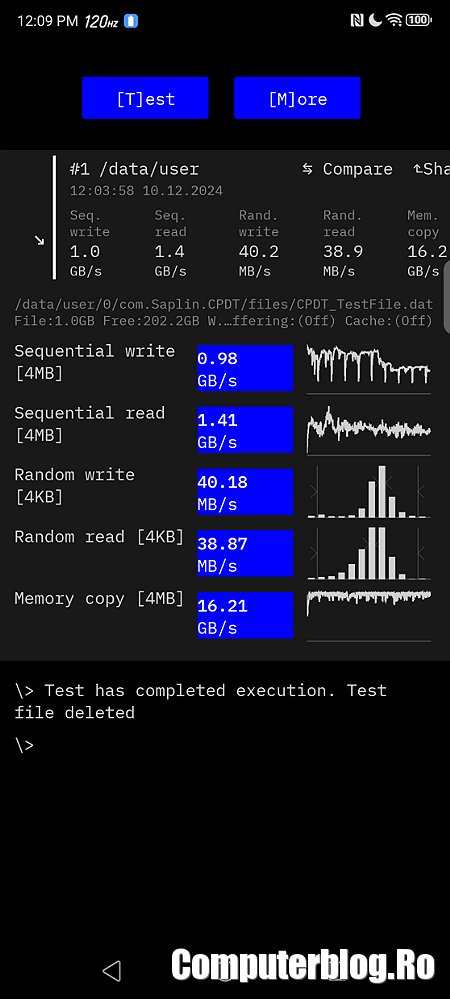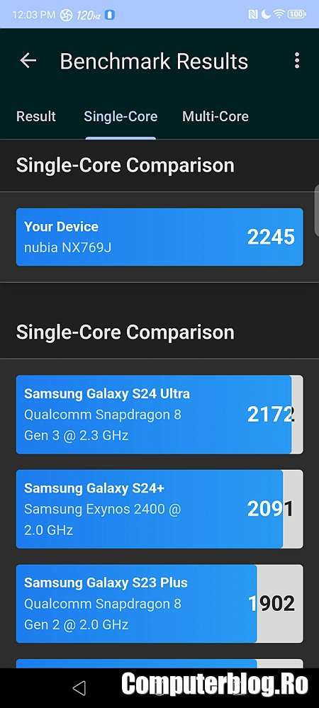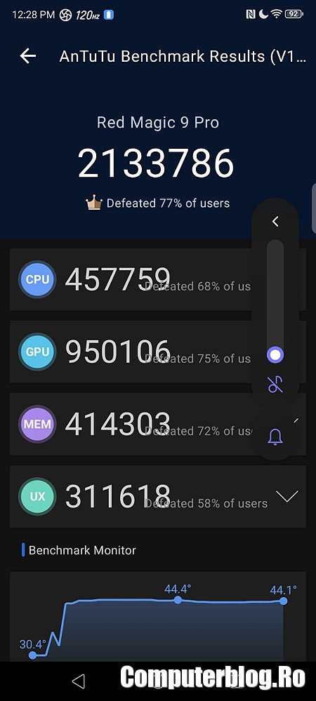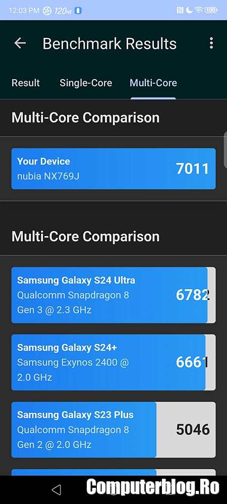 Procesorul Snapdragon 8 Gen 3 se descurcă în continuare foarte bine. Da, este depășit acum de 8 Elite, dar rămâne la fel de bun. Ca de obicei, telefonul de gaming scoate scoruri mai bune decât Samsung Galaxy S24 Ultra sau iPhone 16 Pro Max. Versiunea testată a venit cu 12GB RAM și 256GB de stocare. Am văzut cel puțin alte două care sunt de 16/512GB sau 16/1TB.