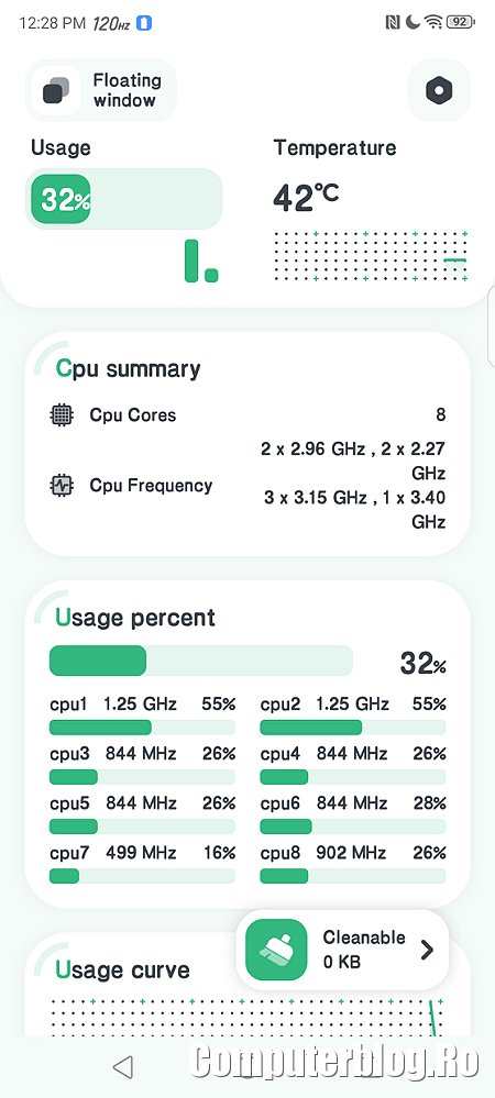 Pe Geekbench a scos 2.250 în single-core și peste 7.000 la multi-core, de asemenea foarte bine. Vitezele de scriere/citire pentru stocare și memorie sunt foarte bune. Dar, cum spuneam, are nevoie de antrenament la partea de autonomie. Testele arată că ține peste 14 ore de utilizare cu ecranul aprins. Dar opțiunile de a prelungi viața bateriei sunt limitate și nu au avut rezultatul dorit.