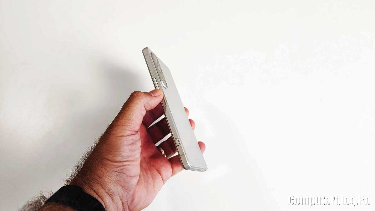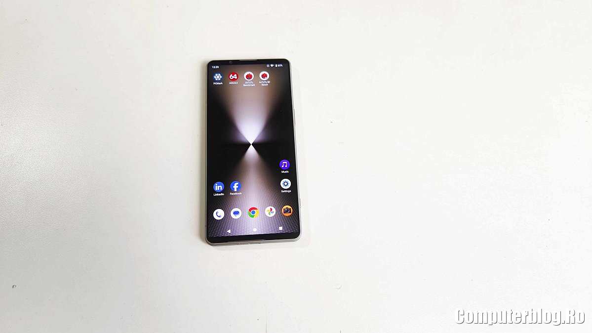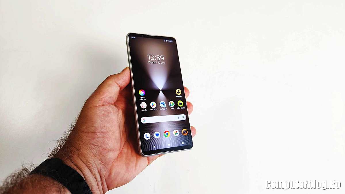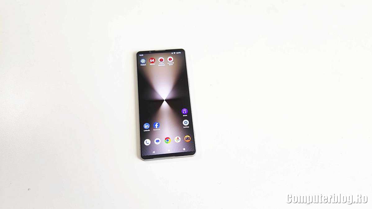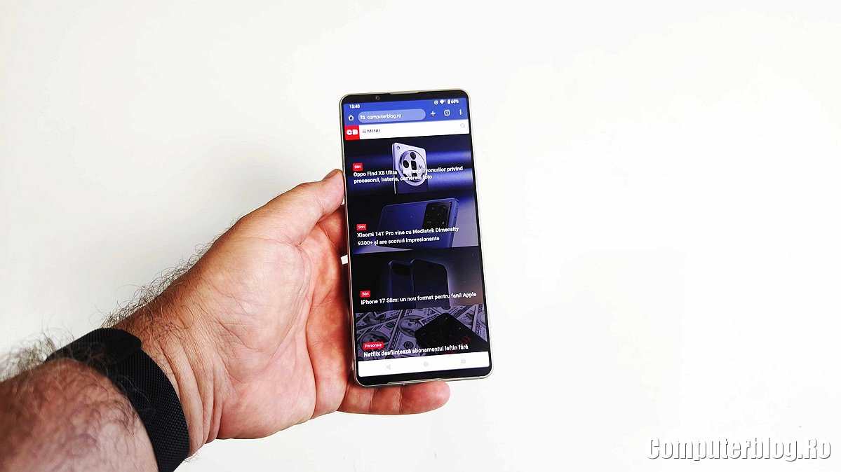 Dar să trecem la părțile pozitive. Pentru prima dată Xperia are un ecran normal. Au ales un panou LTPO OLED de 6.5 inch, dar cu formatul clasic de 19.5:9, spre deosebire de formatul cinematic de 21:9 adoptat la primele cinci modele. Și anul trecut ecranul era foarte îngust și lung, ca o telecomandă. Deși unii clienți îl lăudau și spuneau că este compact, conținutul nu se vede perfect pe el. Nu poți citi corect, nu poți scrie pe tastatură corect. Așa că este o decizie binevenită.