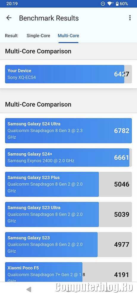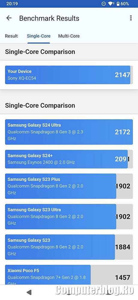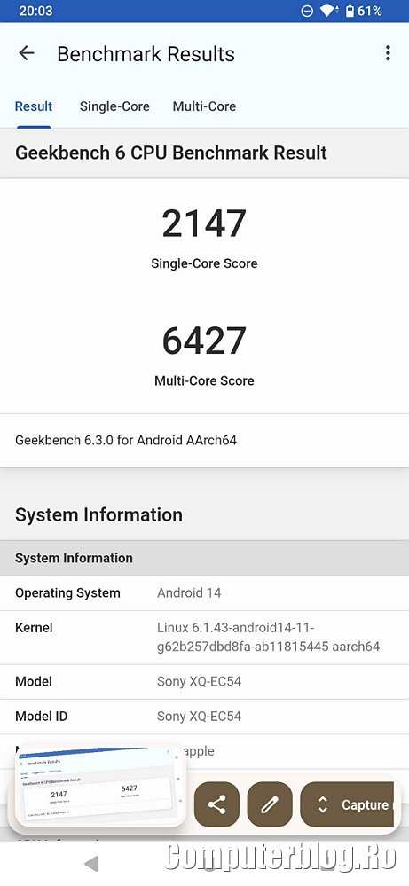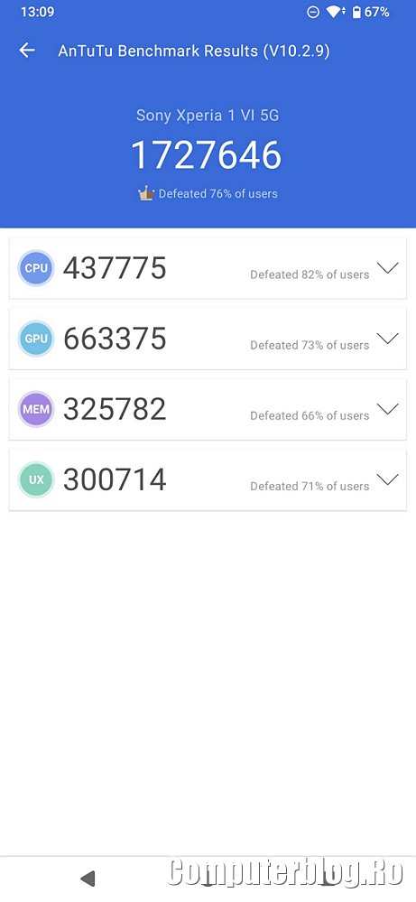 Pe partea de hardware, Xperia 1 VI dă clasă rivalilor. Mai ales celor de la Samsung, bate la distanță terminalele sud-coreene. Atât în testul Antutu, cât și în Geekbench, iar mie personal nu mi s-a părut că se încinge.