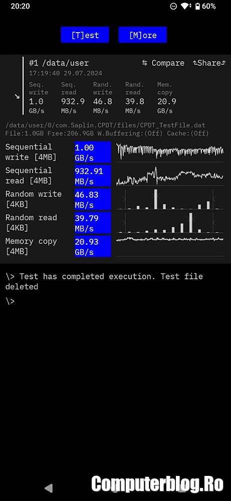 Am rulat principalele teste, ca de obicei, iar apoi am fost foarte impresionat de rezultate. A scos în Antutu 1,75 milioane de puncte, aproape de telefoane de gaming precum ROG Phone 8 Pro. Și în Geekbench vezi cu ochiul liber diferența față de telefoanele Samsung de exemplu. Acum sigur, e greu de comparat cu iPhone, dar stă foarte bine.