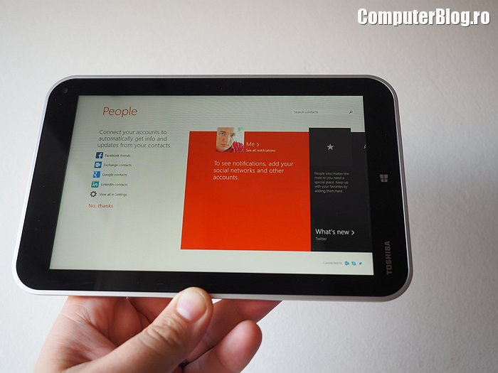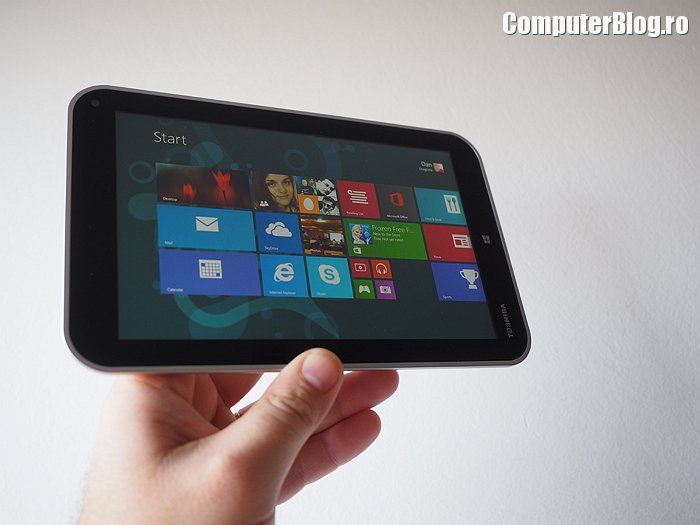 Tableta nu este un super-gadget, dar nici nu este cu mult diferită de concurență, așa cum erau tabletele Windows acum 2-3 ani. Arată la fel ca orice tabletă de 8 inch, chiar dacă este mai groasă decât unele modele Android, are 1 centimetru grosime, nu e cărămidă. Arată ok, marginea argintie care pare metalică se potrivește – e drept – ar fi fost fain să aibă marginile subțiri, dar probabil vor lucra la design în următoarele versiuni. M-am obișnuit și cu interfața Metro, nu mai pare așa extraterestră, ai short-cut-uri la îndemână, deși rămân multe chestii inutile instalate by default.