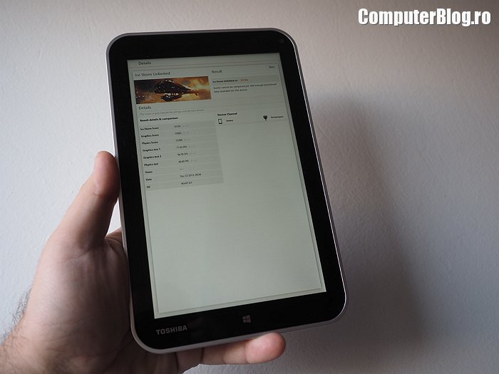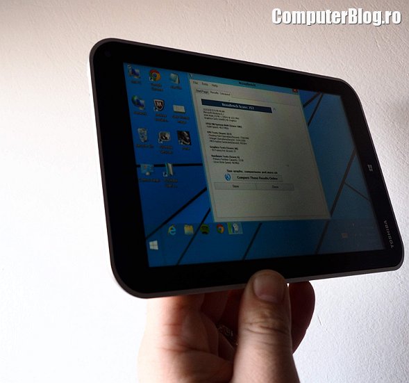 Nu am putut rezista și am rulat două benchmark-uri (de parcă tableta ar fi stație grafică). Dar eram curios să văd cum stă. Nu se bate cu laptopul pe care lucrez, care e Core i5, 4GB de RAM și NVidia de 1GB. Tableta are procesorul Intel Atom Bay Trail-T, despre care AnandTech confirmă că este mai rapid ca orice ARM. Dispune de 2GB de RAM și 32GB pentru stocarea internă (22GB erau utilizabili, din care încă 15 deja umpluți cu alte aplicații).