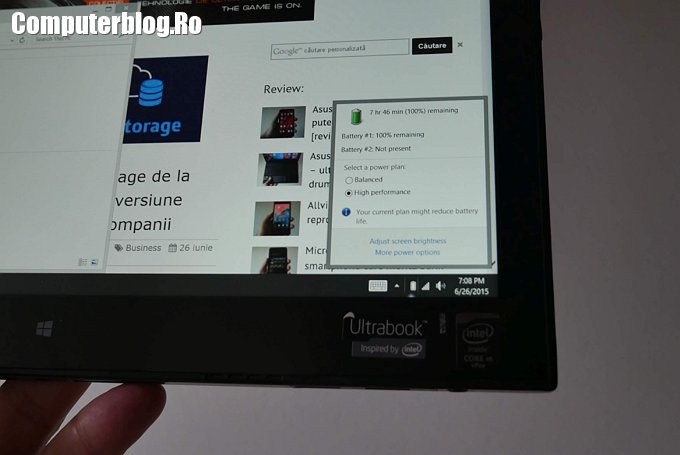 Procesorul este Core M – seria dezvoltată de Intel pentru mobilitate și nu pentru performanță. Este un procesor bun, peste seria Atom și peste modelele ULV (ultra-low voltage), dar ca performanțe sub modelele Core i din cea mai nouă generație. Este un compromis bun pentru cei care călătoresc des, pentru cei care petrec mult timp în avion, între avioane și între ședințe și întâlniri cu clienții. Este un dual-core la 1,2 GHz, care poate urca la 2,9Ghz atunci când este nevoie. De asemenea, are tehnologii precum Hyper-Threading pentru creșterea performanței, are 4MB de memorie cache, lucrează pe 64 de biți, suportă 16GB de RAM. Modelul testat a venit cu 8GB de RAM, cred că este suficient pentru business, dar cei care rulează aplicații mai complexe au nevoie de mai mult.