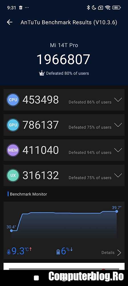 Am rulat pe telefon principalele teste benchmark pe acest telefon. Culmea este că nu a părut că se încinge prea tare. În cazul procesoarelor Mediatek s-a mai întâmplat să se încingă, dar acum pare mai bine gestionat.