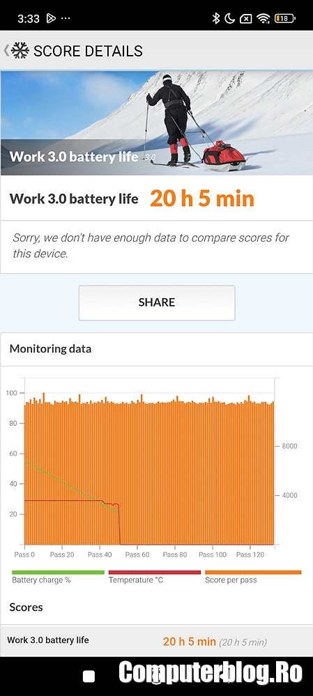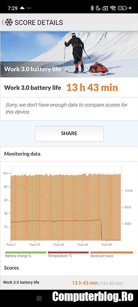 Autonomia maximă a fost de 20 de ore și 5 minute, cu ajutorul Power Saving, reducerea luminozității ecranului, a ratei de refresh. Pe scurt, se descurcă și în călătorii mai lungi.