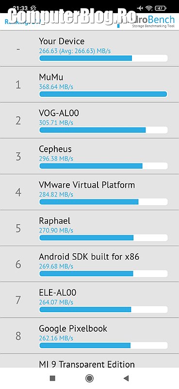 Pe testul de stocare a ieșit bine, dovadă că tehnologia UFS 2.2 merită banii. Este rapidă, mult peste 2.1, dar sub cifele 3.0 sau 3.1 care sunt foarte puternice.