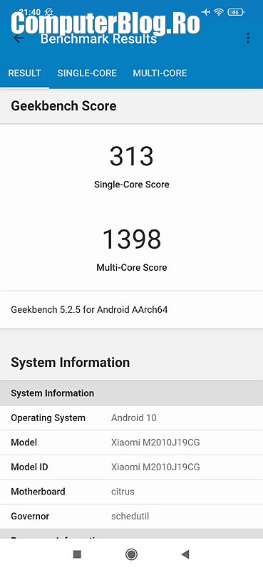 Pentru a avea o imagine cât de cât despre terminal am rulat Antutu, Geekbech, testul de stocare, test de autonomie, am instalat Fortnite și am făcut în videoclip teste de display și audio. Per-total am fost mulțumit de rezultate, dar nu este un telefon pentru gaming. Cred că cel mai ieftin terminal care permite și gaming, dar și divertisment de calitate este Redmi Note 9 Pro.