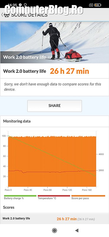 Bateria de 6.000 mAh a atins în test 26,5 ore de utilizare continuă. Probabil folosind Power Saving și o utilizare cumpătată a telefonului ajungeți la mai mult de 52 de ore. Peste două zile de utilizare. Oricum, este clar că acest telefon trece peste o zi de lucru și a doua zi mai are baterie.