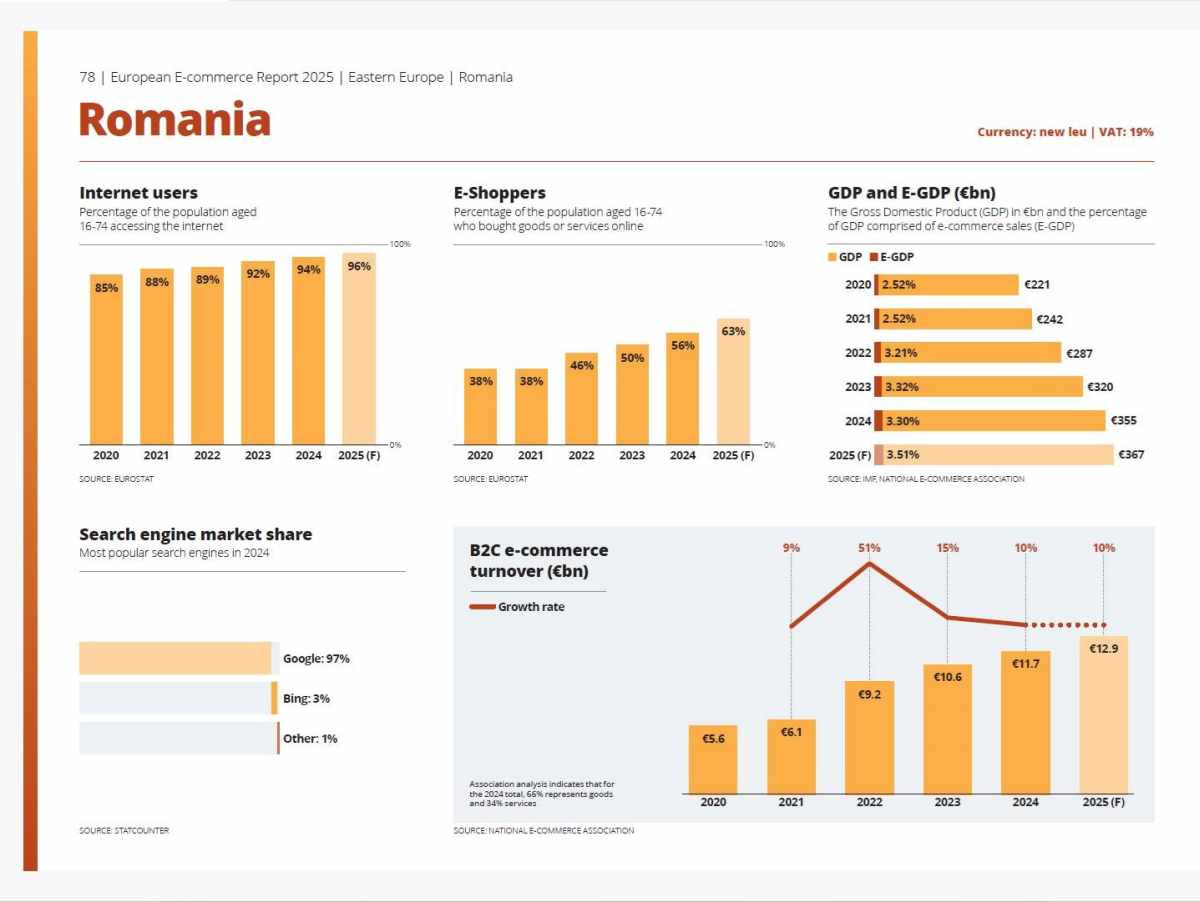 Comerțul electronic din România este așteptat să atingă 3,5% din PIB în 2025, consolidându-și poziția în Top 10 state membre UE ca E-GDP, potrivit European E-Commerce Report 2025. România ocupă locul 9 la nivel european și locul 3 în Europa Centrală și de Est, după Polonia și Cehia.