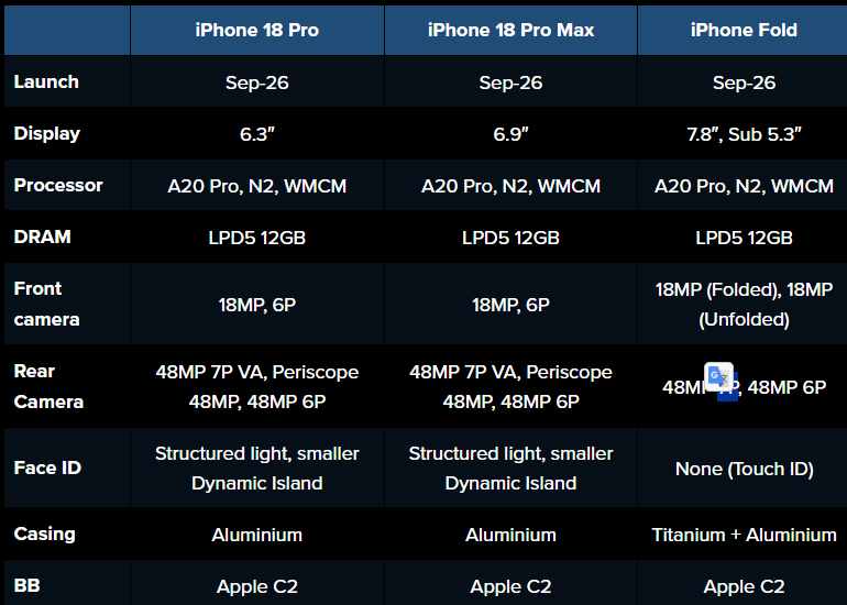 Apple este așteaptată să lanseze doar trei modele de iPhone în toamna anului 2026: iPhone 18 Pro, iPhone 18 Pro Max și un model pliabil, iPhone Fold. Celelalte modele, precum iPhone 18 de bază, vor sosi în primăvara următoare, alături de iPhone 18e și iPhone Air 2.