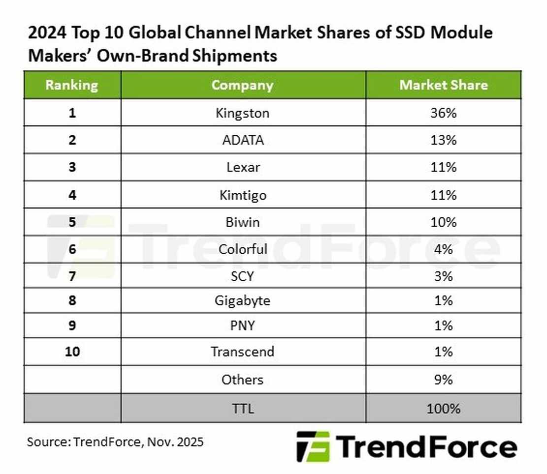 Conform celui mai recent raport TrendForce, livrările globale de SSD-uri au ajuns în 2024 la 101 milioane de unități, în scădere cu 14% față de anul precedent, pe fondul cererii slabe și al faptului că notebook-urile au atins o rată de echipare cu SSD de 100%. În acest context dificil, Kingston nu doar că și-a menținut poziția de lider, ci a reușit să controleze 36% din piața de SSD-uri, un rezultat care o poziționează detașat în fața celorlalți producători.