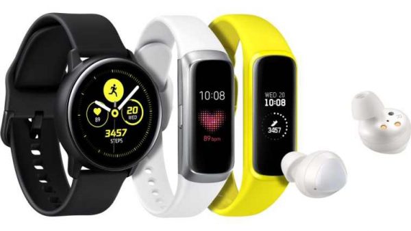 În cadrul evenimentului din seara asta au fost lasnate Samsung Galaxy Fit și Galaxy Fit e: brățări fitness de utilizat în fiecare zi pentru pasionații de sport și pentru toată lumea. În poză sunt alături de Watch Active, ceasul smart de la Samsung, precum și căștile Galaxy Buds.